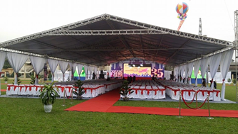 Khung giàn không gian hợp kim nhôm siêu bền, siêu nhẹ. Mái bạt Hiflex màu trắng. Không trần , dèm
